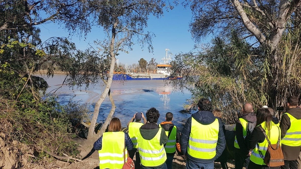 El encuentro concluyó con una visita a la zona en la que trabaja la draga para el mantenimiento de la canal. El grupo pudo asistir a la operativa para depositar los sedimentos en el vaciadero de Butano, convertidos en humedales para la cría y reproducción de la avifauna del estuario, un proyecto que ha contado con el sello 'Working with Nature' y con el Premio de Medio Ambiente de la Junta de Andalucía.