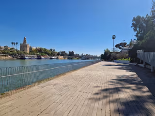 El Muelle Camaronero fue una zona de actividad portuaria y hoy en día forma es parte del domino público portuario. Destaca por su ubicación privilegiada a nivel del agua, con acceso mediante una rampa desde la calle Betis. Es un espacio puerto-ciudad icónico que funciona como mirado al permitir a la ciudanía asomarse al conjunto monumental histórico y ver Sevilla, la Torre del Oro y la Catedral, desde la otra orilla.
