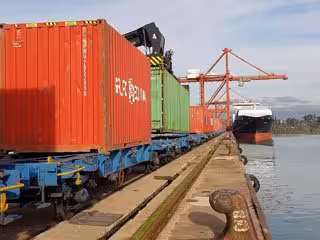 Tren en el Muelle del Centenario del Puerto de Sevilla, junto al buque LOLA B - Puerto de Sevilla
