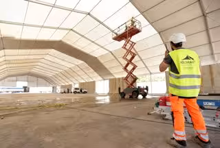Operarios realizan tareas de limpieza y de montaje en carpas del puerto de Málaga, donde preparan las instalaciones para la próxima Operación Paso del Estrecho, suspendida dos años por la pandemia de la COVID-19. A 23 de mayo de 2022 en Málaga, Andalucía - ÁLEX ZEA/EUROPA PRESS