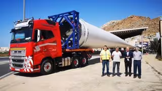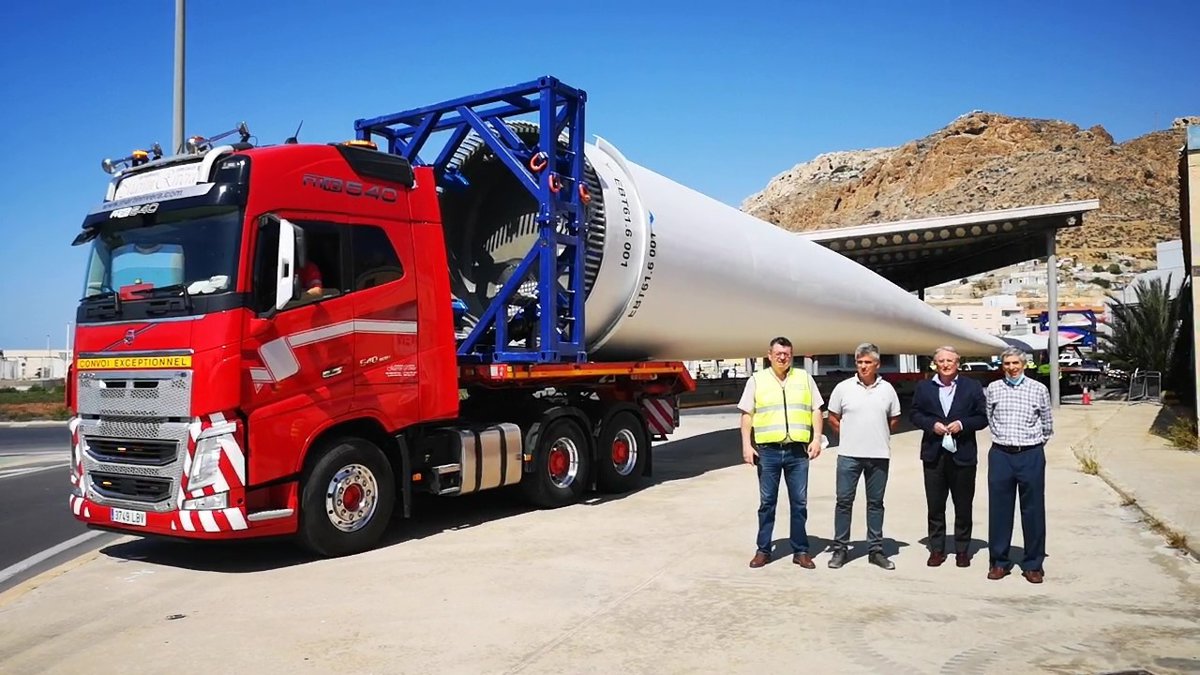 Las palas, de 65 metros de longitud, han sido fabricadas por la empresa Eblades Technology SL, en Ferreira (Granada). Su traslado hasta Almería lo realiza la empresa de transportes especiales Martín Rivera en unos camiones de 56 metros de longitud.