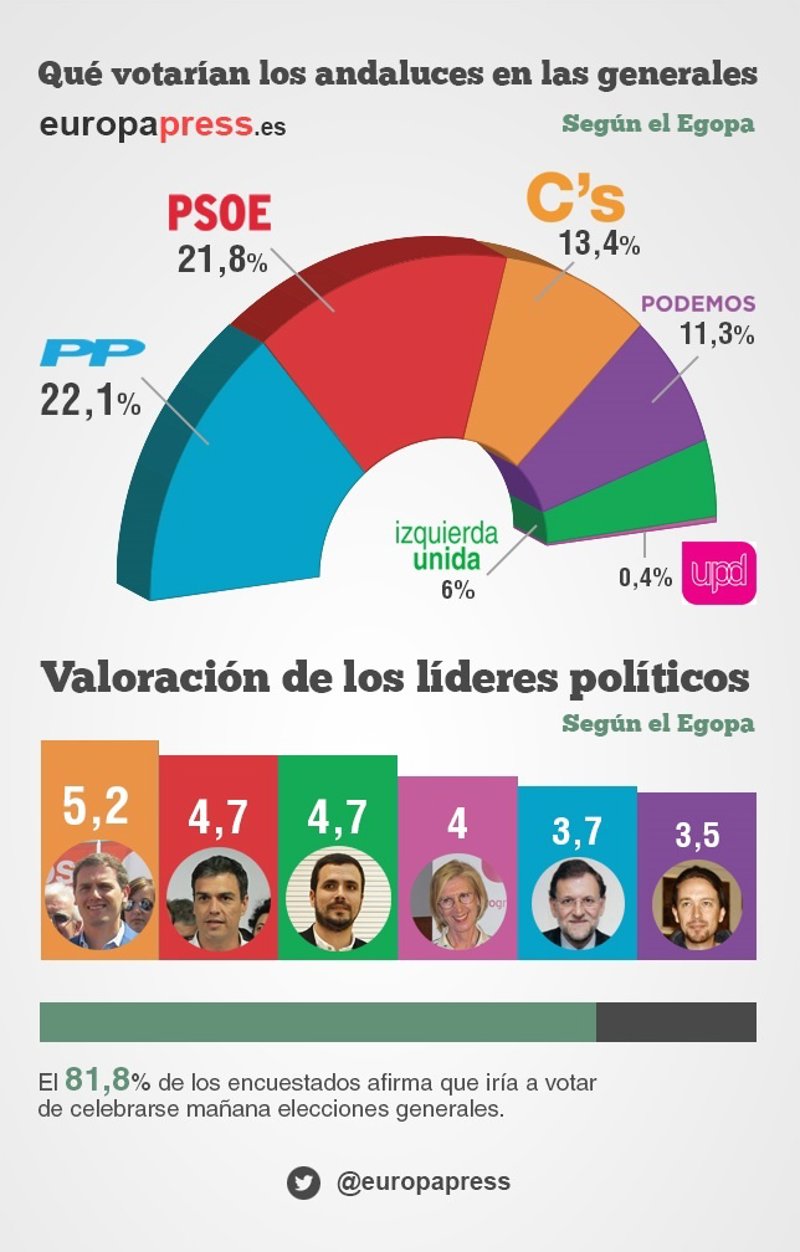 El 22,1 por ciento de los andaluces votaría al PP y el 21,8 por ciento al PSOE en el supuesto de que mañana se celebraran elecciones generales, según se desprende de un estudio sobre intención de voto en dichos comicios recogido en el Estudio General de Opinión Pública de Andalucía (Egopa) de verano 2015.