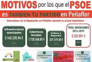 En la red social Facebook, según han avisado, se puede comprobar cómo las agrupaciones municipales del PSOE en Bollullos de la Mitación, El Saucejo, La Roda, La Puebla de Cazalla, Peñaflor, Pedrera o Carrión de los Cespedes, han difundido anuncios de "marcado carácter electoral, usando los logotipos de diferentes programas de la Diputación de Sevilla, como el Plan Supera, el Programa de Urgencia Municipal, el Circuito Provincial de las Artes Escénicas y Musicales, el Plan de Cohesión Social, así como el logotipo de la propia Diputación".
