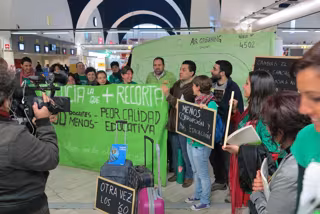 Además, los participantes han portado una pancarta con el mensaje 'Air Griñaning, low cost, vuelo número 4.502', y "hemos cantado 'La canción del emigrante' con la voz de Mariano Rajoy y hemos versionado el tema 'Me voy' de Julieta Venegas", explica Cózar, quien recuerda que todas estas acciones "van encaminadas a que la consejera de Educación se reúna con nosotros, que hasta el momento sigue sin mantener ningún contacto".