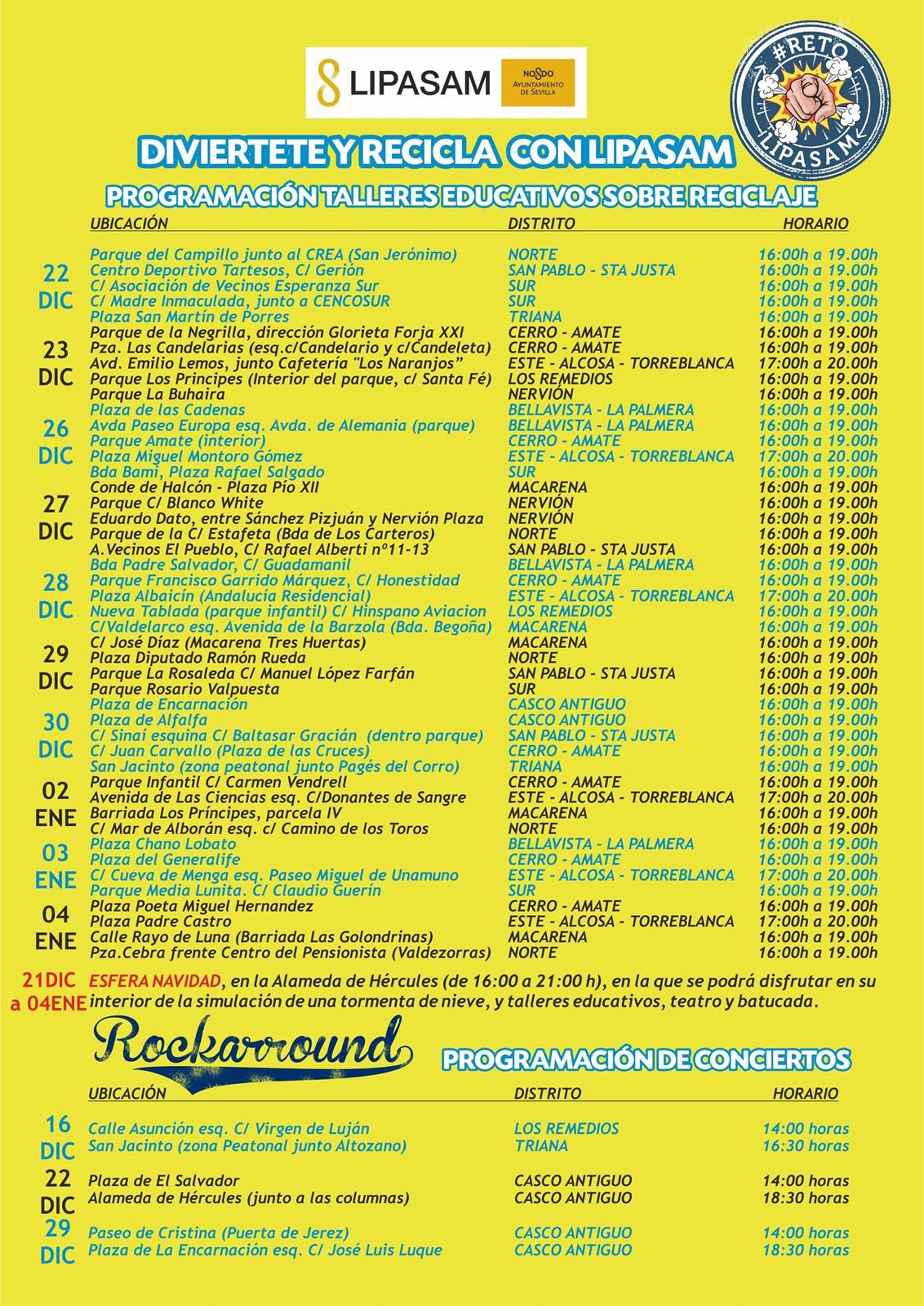Asimismo, 'Diviértete y recicla con Lipasam' es un programa educativo en el que el respeto al medio ambiente y la música son los protagonistas, llegará a los once distritos de la ciudad con actividades que se extienden entre el 22 de diciembre al 4 de enero. Cada actividad comenzará con una batucada y un pasacalles en torno a las 16,00 horas para dar paso a los talleres ambientales, que empezarán a las 16,30 horas y están destinados a toda la familia. Asimismo, sobre las 18,30 horas se cerrarán las jornadas con otra sesión musical y teatro.
