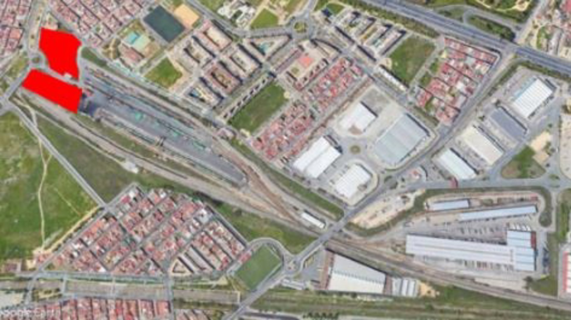 Vista aérea de la terminal de La Negrilla, con las parcelas objeto de licitación en rojo - ADIF