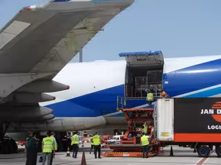 Para su descarga, se ha establecido un dispositivo especial, que ha permitido el acceso a pie de aeronave de más de una docena de camiones con plataformas elevadoras. El Boeing 747-400F tiene 70,6 metros de longitud y 64,9 de envergadura (distancia entre las alas).