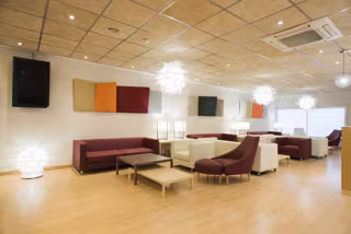 La sala cuenta con una zona de descanso y trabajo confortable y