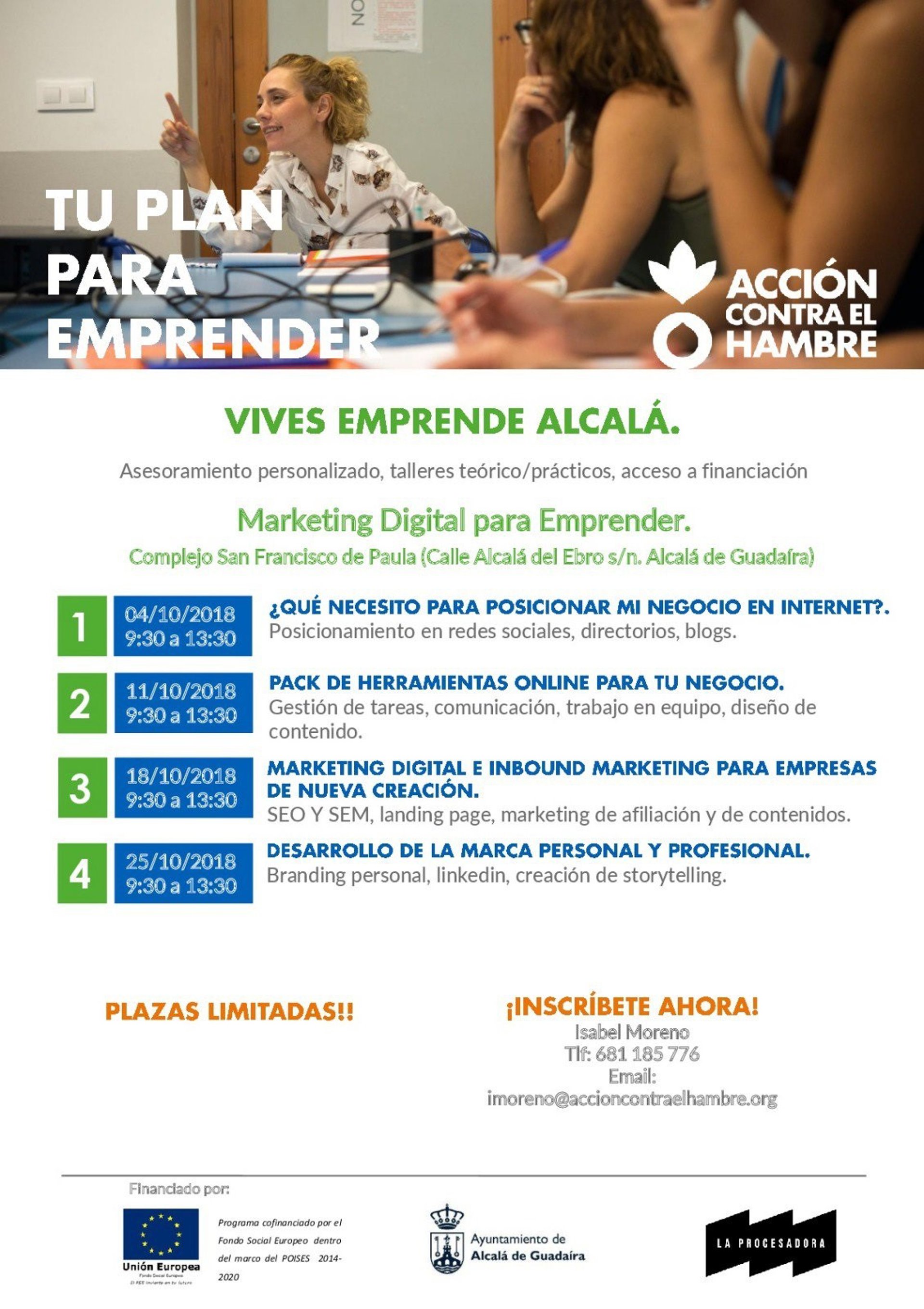 Bajo el título 'Marketing Digital para Emprender', los cuatro talleres teórico-prácticos, que incluyen posicionamiento en Internet y redes, herramientas 'on-line' de gestión de tareas, diseño de contenidos, o la creación de una marca profesional, están organizados por la Fundación Acción contra el Hambre y el Ayuntamiento alcalareño y se desarrollarán los jueves del mes de octubre en las instalaciones del complejo municipal de formación San Francisco de Paula.