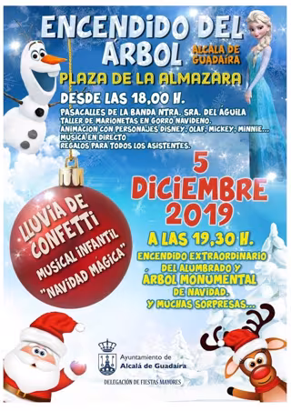 La gran fiesta tendrá lugar este jueves a partir de las 18,00 horas en torno al gran árbol de Navidad de la Plaza de la Almazara para dar paso, con posterioridad, al tradicional encendido navideño. - AYUNTAMIENTO DE ALCALÁ DE GUADAÍRA (SEVILLA).