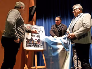 El delegado de Fiestas Mayores, Enrique Pavón, el presidente de la Asociación del Carnaval, Antonio Sanabria y el autor han descubierto la obra, de gran colorido en la que se muestra el rostro de un gran arlequín veneciano por encima del cual hay mucho colorido con la silueta de fondo de la ciudad y del teatro Gutiérrez de Alba.
