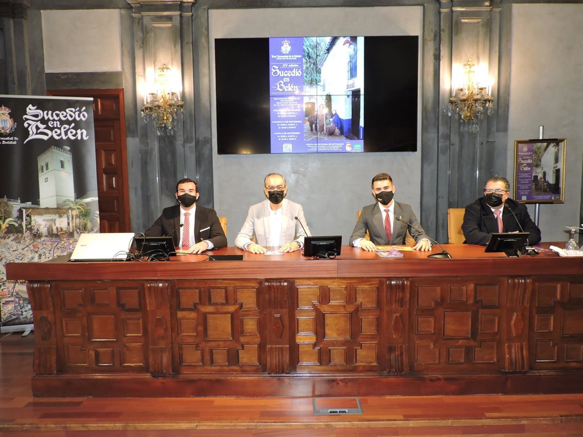 El alcalde de la localidad sevillana de Alcalá del Río, Antonio Campos, acompañado de la primera Teniente de Alcaldía, Trinidad Ruiz, y miembros de la Junta de Gobierno de la Hermandad de La Soledad, Emilio García, Pepe Castaño y Francisco José Zambrano, coordinador general, ha presentado en la Casa de la Provincia de la Diputación el cartel de la edición 2021 de 'Sucedió en Belén'.