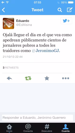 Además, lamenta que se use la "impunidad" de las redes sociales para "amenazar de muerte" y critica que aún no se haya pronunciado "nadie del SAT o de IU en contra de esto". "No ha existido ningún acto de solidaridad o apoyo por su parte. La política es la política pero el pasar ciertas rayas rojas e insultos no se debe permitir por parte de nadie. Políticamente deja mucho que desear", recalca.