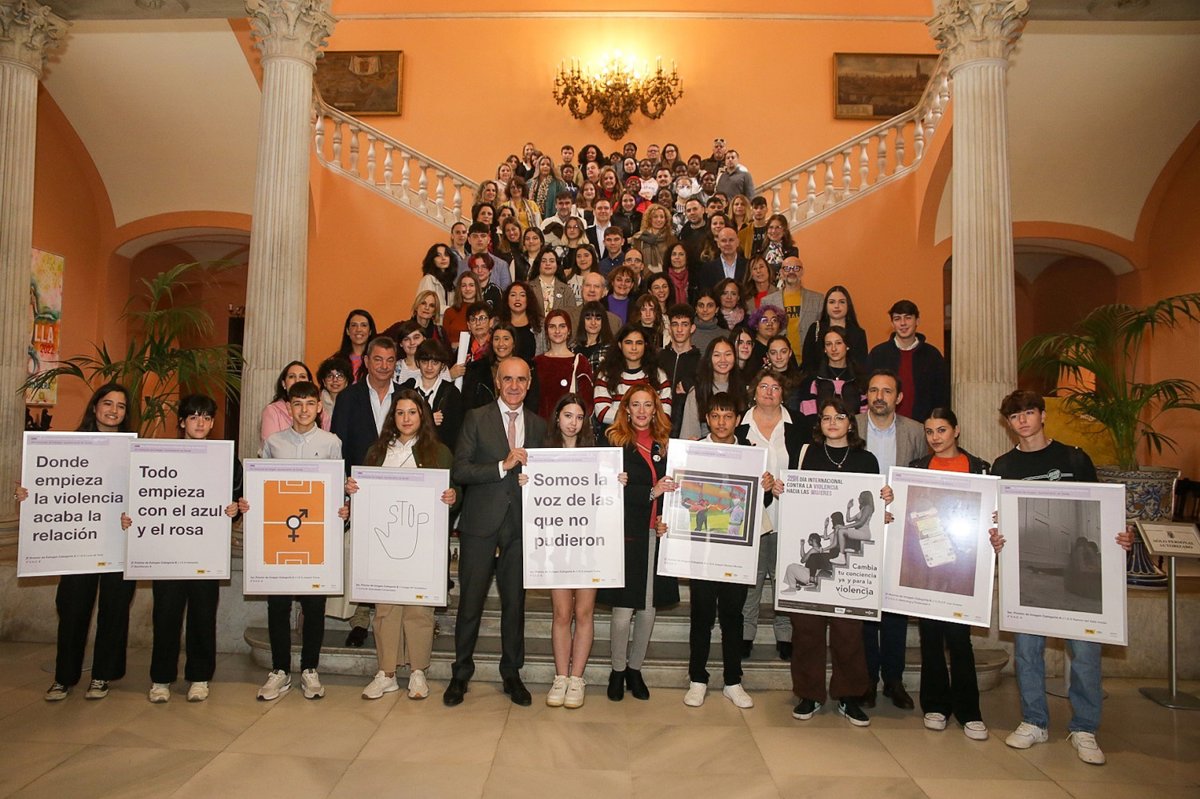 El alcalde de Sevilla, Antonio Muñoz, ha presidido este jueves la entrega de premios a los estudiantes de colegios e institutos que han participado en el concurso de imagen gráfica y eslogan impulsado por el Ayuntamiento de Sevilla, a través de la Delegación de Igualdad y Recursos Humanos, con motivo del 25 de noviembre, Día Internacional contra la Violencia hacia las Mujeres de 2022. La dotación de los premios ha sido de 1.000 euros para el primer clasificado, 350 para el segundo y 150 para el tercero.