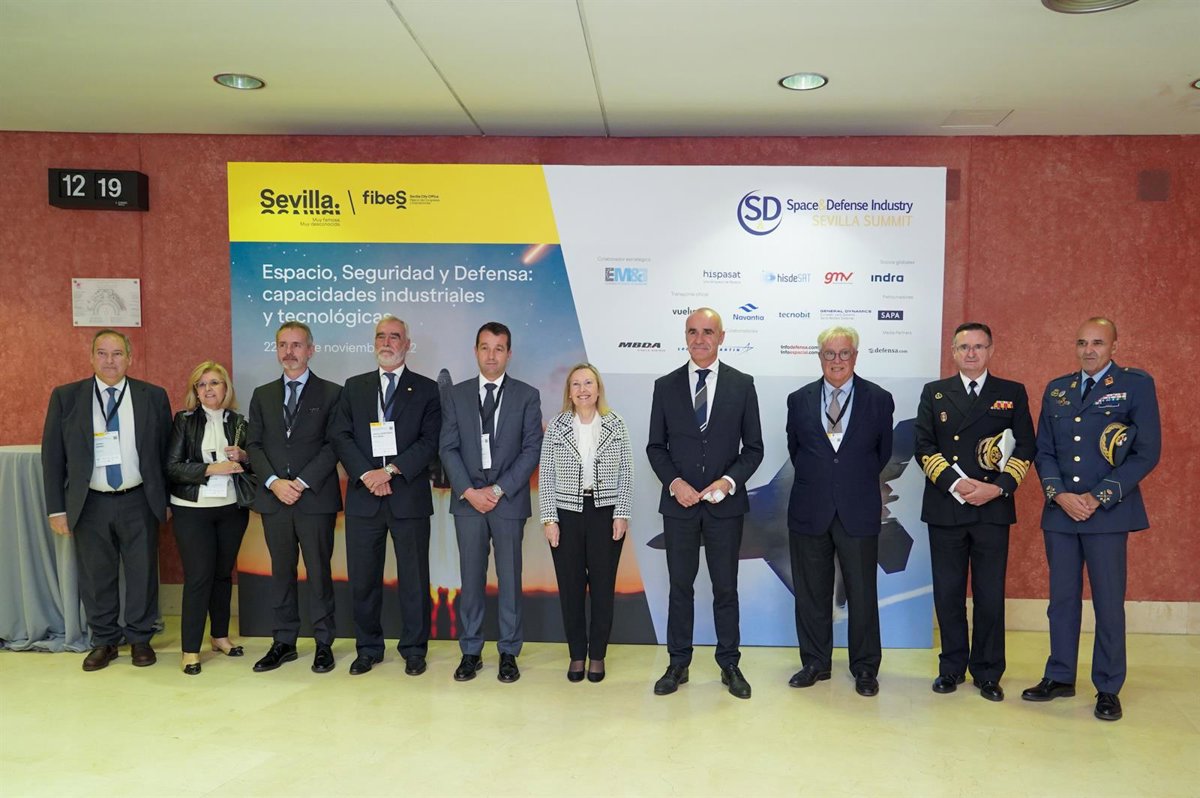 El alcalde de Sevilla, Antonio Muñoz, cuarto por la derecha, en la inauguración del 'Space & Defense Industry Sevilla Summit' bajo el título 'Espacio, Seguridad y Defensa: capacidades industriales y tecnológicas'. - FRANCISCO J. OLMO / EUROPA PRESS