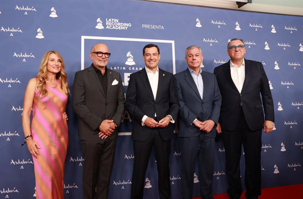 El CEO de los Latin Grammy, Manuel Abud (1i), el presidente de la Junta de Andalucía, Juanma Moreno (c), el alcalde de Sevilla, Jose Luis Sanz (2d), y el consejero de cultura y Andalucía exterior, Arturo Bernal (1d) en el photocall de la gala. - Rocío Ruz - Europa Press