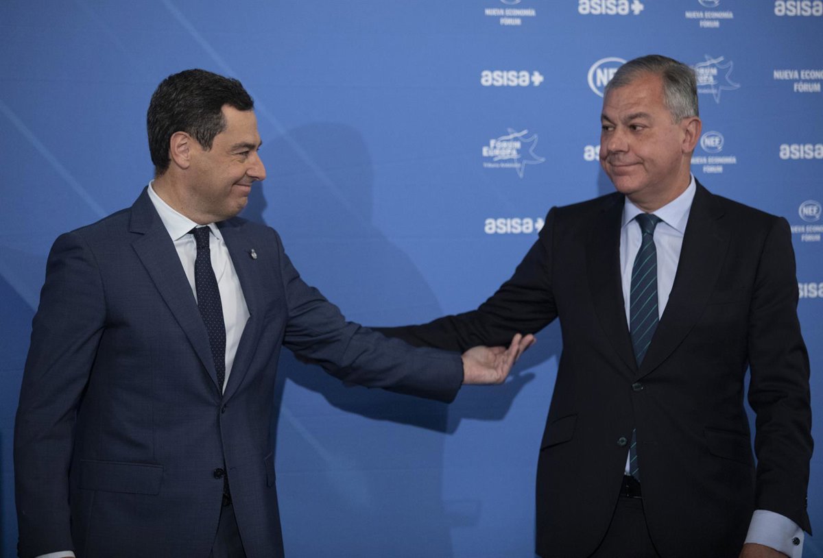 Archivo - El candidato del PP a la Alcaldía de Sevilla, José Luis Sanz (d), junto al presidente de la Junta de Andalucía, Juanma Moreno (i) en un desayuno informativo. Imagen de archivo. - María José López - Europa Press - Archivo