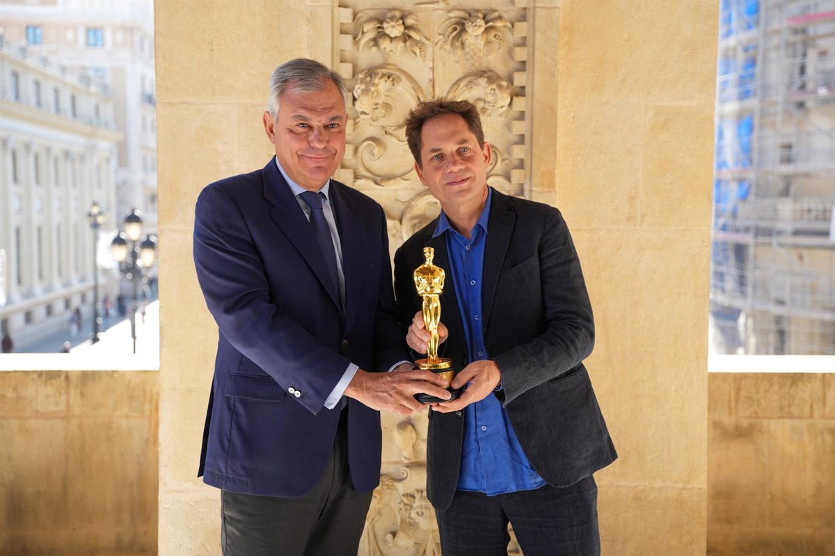 El alcalde de Sevilla, José Luis Sanz, junto al productor y cineasta francés Ron Dyens, ganador del Óscar y el Globo de Oro al mejor largometraje de animación por 'Flow' (2024). - AYUNTAMIENTO DE SEVILLA