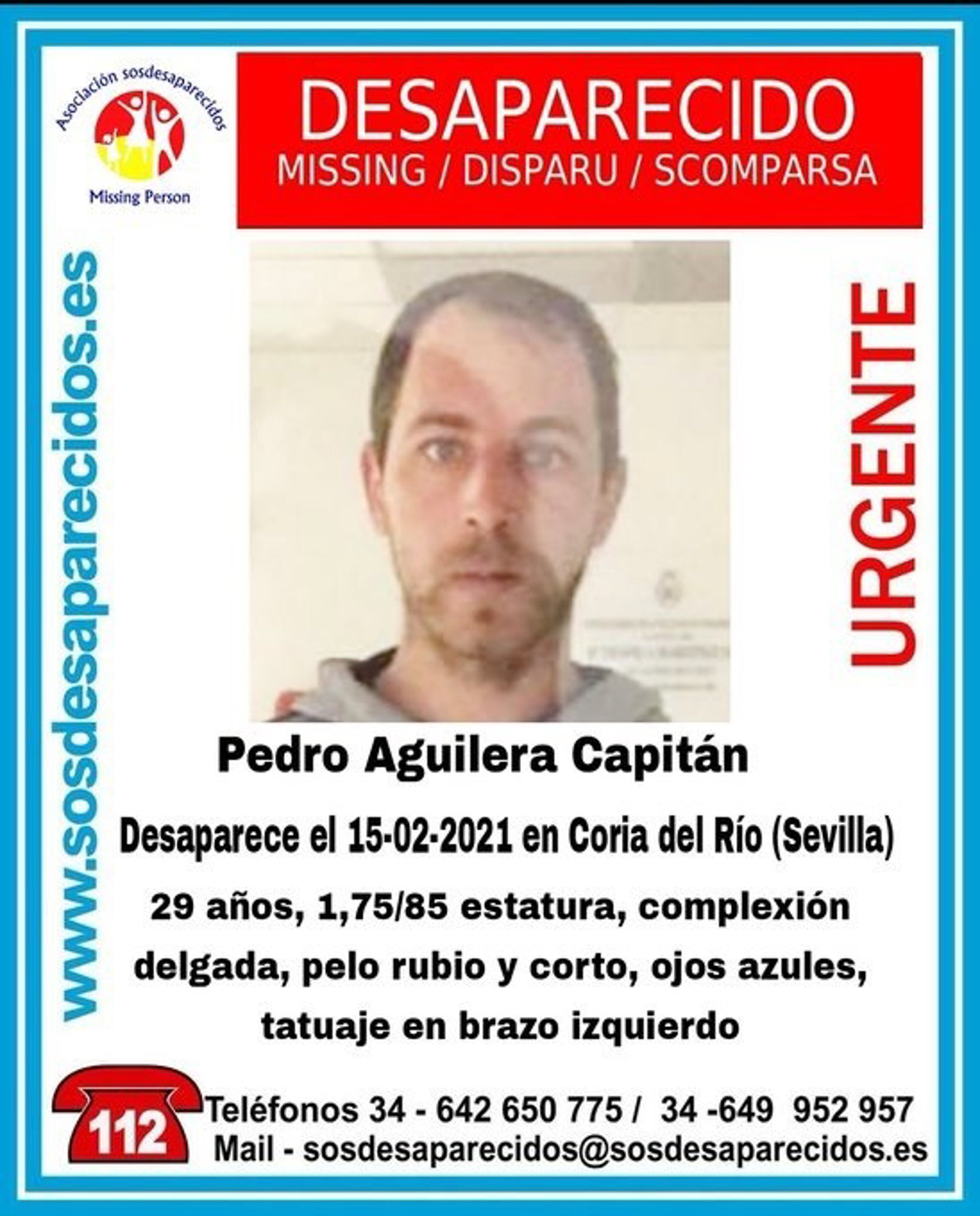 La asociación SOS Desaparecidos ha alertado de la desaparición de Pedro Aguilera Capitán, un joven de 29 años cuyo rastro se perdió el pasado lunes en la localidad sevillana de Coria del Río.