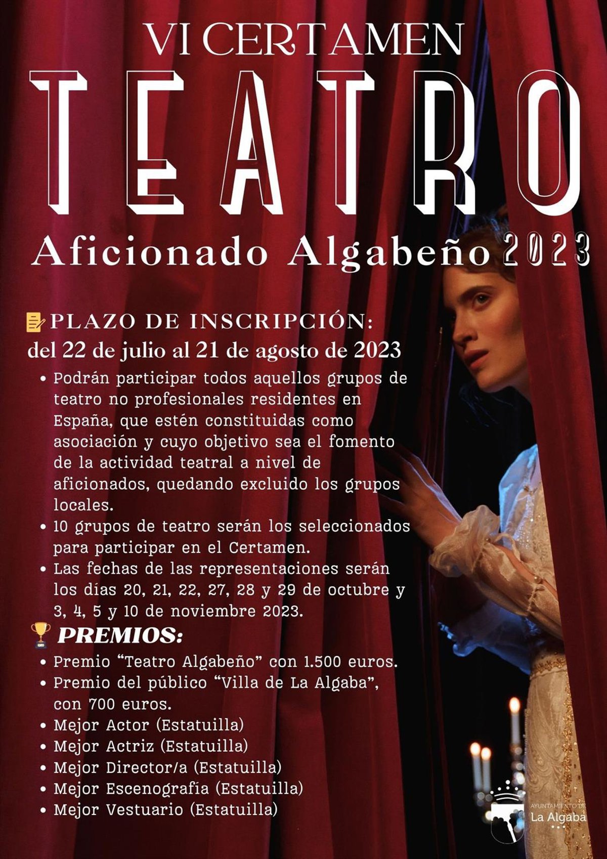 En el Certamen, podrán participar diez grupos de teatros "no profesionales" que podrán optar por los premios a 'Mejor Actor', 'Mejor Actriz', 'Mejor Director', 'Mejor Escenografía' y 'Mejor Vestuario', así como el galardón a la mejor obra 'Teatro Algabeño' dotado con 1.500 euros y premio del público 'Villa de La Algaba' dotado con 700 euros.