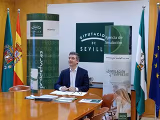 El diputado provincial Rodríguez Hans, en la firma telemática del convenio con Castilla- La Mancha sobre la Agencia de Simulación de Empresas de Prodetur. - DIPUTACIÓN DE SEVILLA