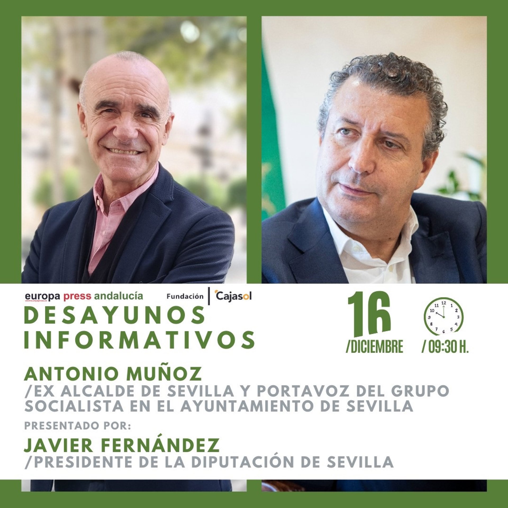 Cartel del desayuno informativo de Europa Press Andalucía con el portavoz del PSOE en el Ayuntamiento de Sevilla, Antonio Muñoz, presentado por el presidente de la Diputación y secretario provincial del PSOE, Javier Fernández, el 16 de diciembre - EUROPA PRESS