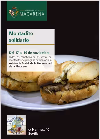 La Bodeguita Romero ha organizado la primera edición del 'Montaíto de pringá solidario' con la que pretenden colaborar con la asistencia social de la Hermandad de la Macarena, donándole los beneficios de todas las ventas que se produzcan de su plato más popular. Esta iniciativa tendrán lugar del 17 al 19 de noviembre.