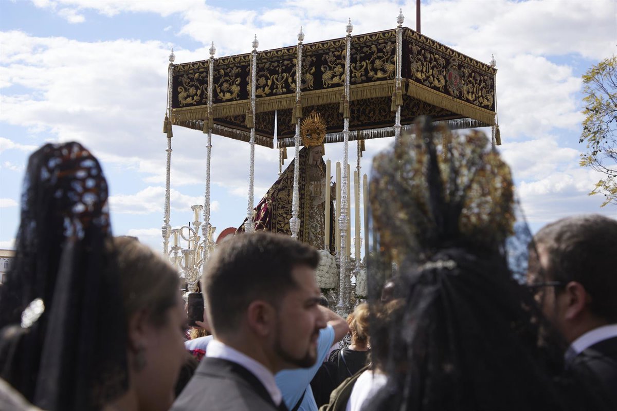 Archivo - Dos mujeres vestidas de Mantilla ven el paso de la Virgen de la Victoria, en la Semana Santa en Sevilla 2022. Jueves Santo a 14 de marzo de 2022 - Joaquin Corchero - Europa Press - Archivo