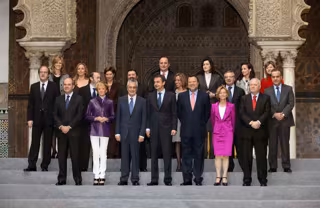 Antes del inicio de la reunión, el presidente del Gobierno, José Luis Rodríguez Zapatero, y los 16 ministros de su gabinete posaron para la tradicional foto de familia junto al presidente de la Junta de Andalucía, José Antonio Griñán, y el alcalde de Sevilla, Alfredo Sánchez Monteseirín.