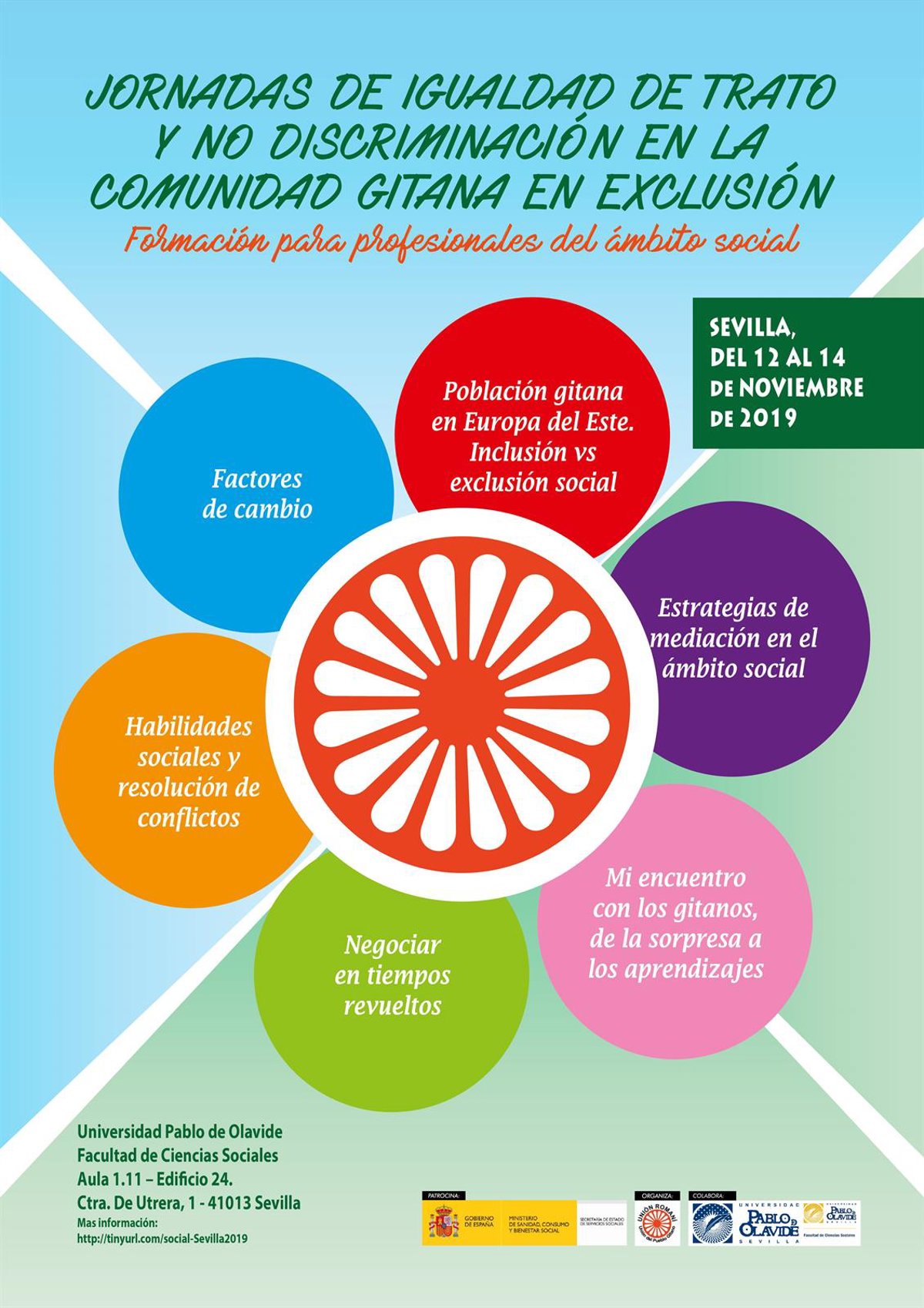 Cartel de las Jornadas de la Universidad Pablo de Olavide sobre igualdad de trato y no discriminación a la comunidad gitana en exclusión. - UNIVERSIDAD PABLO DE OLAVIDE