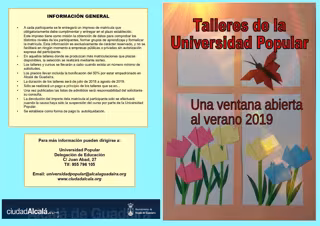 El Ayuntamiento de Alcalá de Guadaíra (Sevilla) abre entre el 3 y el 14 de junio el plazo de inscripción para los talleres de verano de la Universidad Popular, una iniciativa de ocio y proyección del desarrollo personal que cuenta con 21 años de historia en la ciudad y que tiene preparados para este periodo estival de 2019 un total de 14 talleres además de las opciones infantiles.