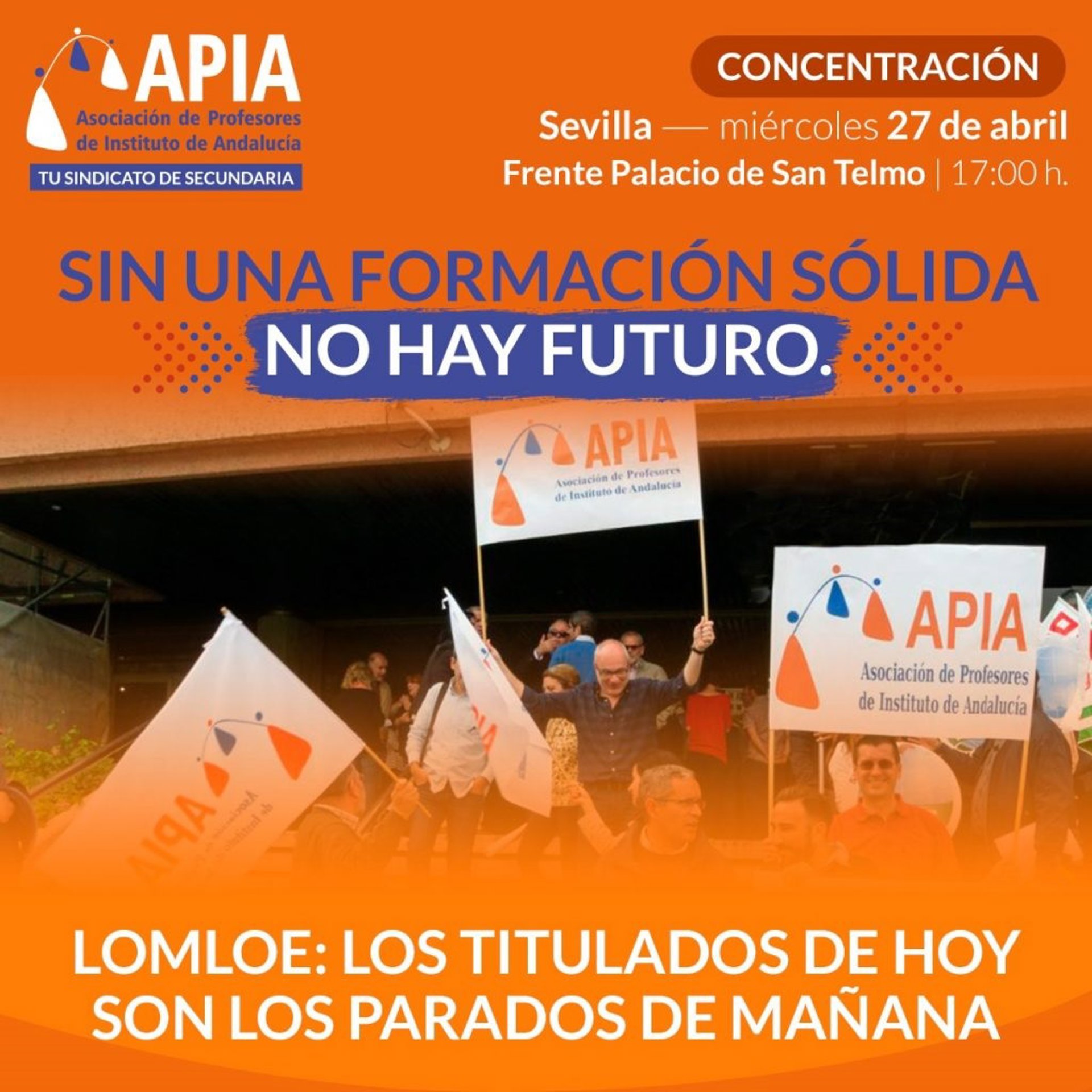 La Asociación de Profesores de Instituto de Andalucía (APIA) ha llamado este lunes a los docentes andaluces a concentrarse el próximo miércoles, 27 de abril, frente al Palacio de San Telmo en Sevilla con el lema 'Lomloe: Los titulados de hoy son los parados de mañana. Sin una formación sólida no hay futuro', con la que pretenden mostrar su "rechazo" a la que han calificado como una "mala ley".