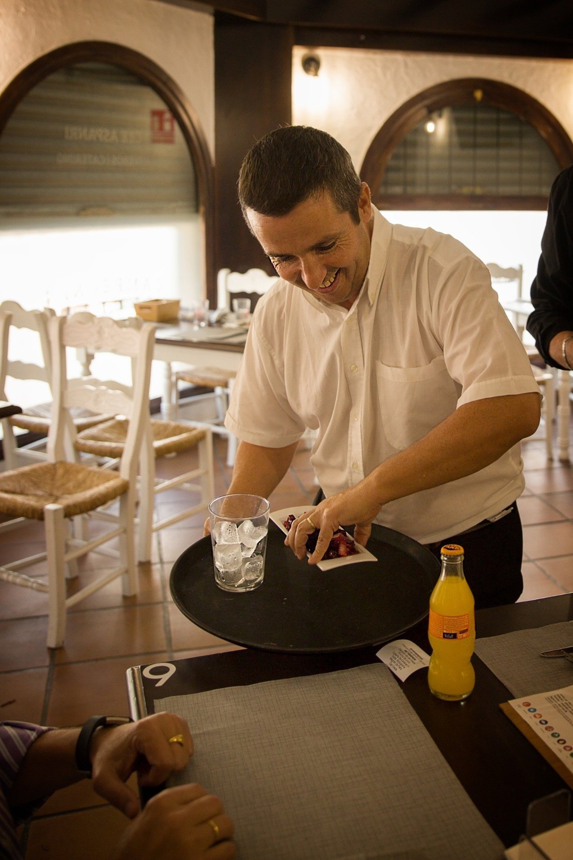 Un camarero con discapacidad intelectual atendiendo a una mesa del mesón 'Campeones' del barrio sevillano de Nervión. - ASPANRI DOWN