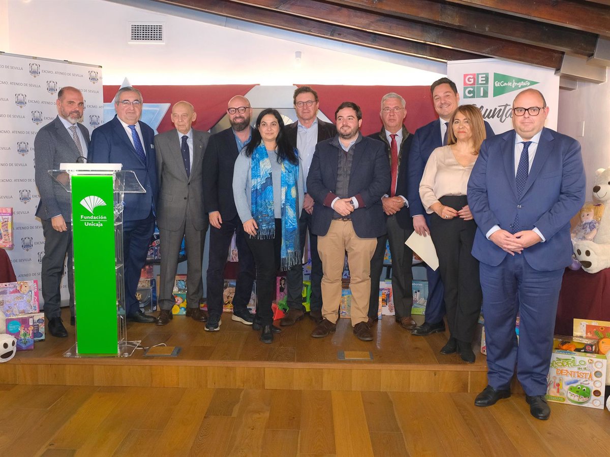 El Ateneo de Sevilla, representado por su presidente, Emilio Boja, y el Vocal de Acción Social, José Antonio Romero Pérez, junto a la responsable del Centro Fundación Unicaja de Sevilla, Sara Rodríguez, han hecho entrega de alrededor de 6.000 juguetes nuevos a las entidades adheridas al convenio de colaboración de acción social entre las que se encuentran hermandades, Cáritas y unidades de trabajo social municipales para que los repartan a las familias en riesgo de exclusión a las que atienden.