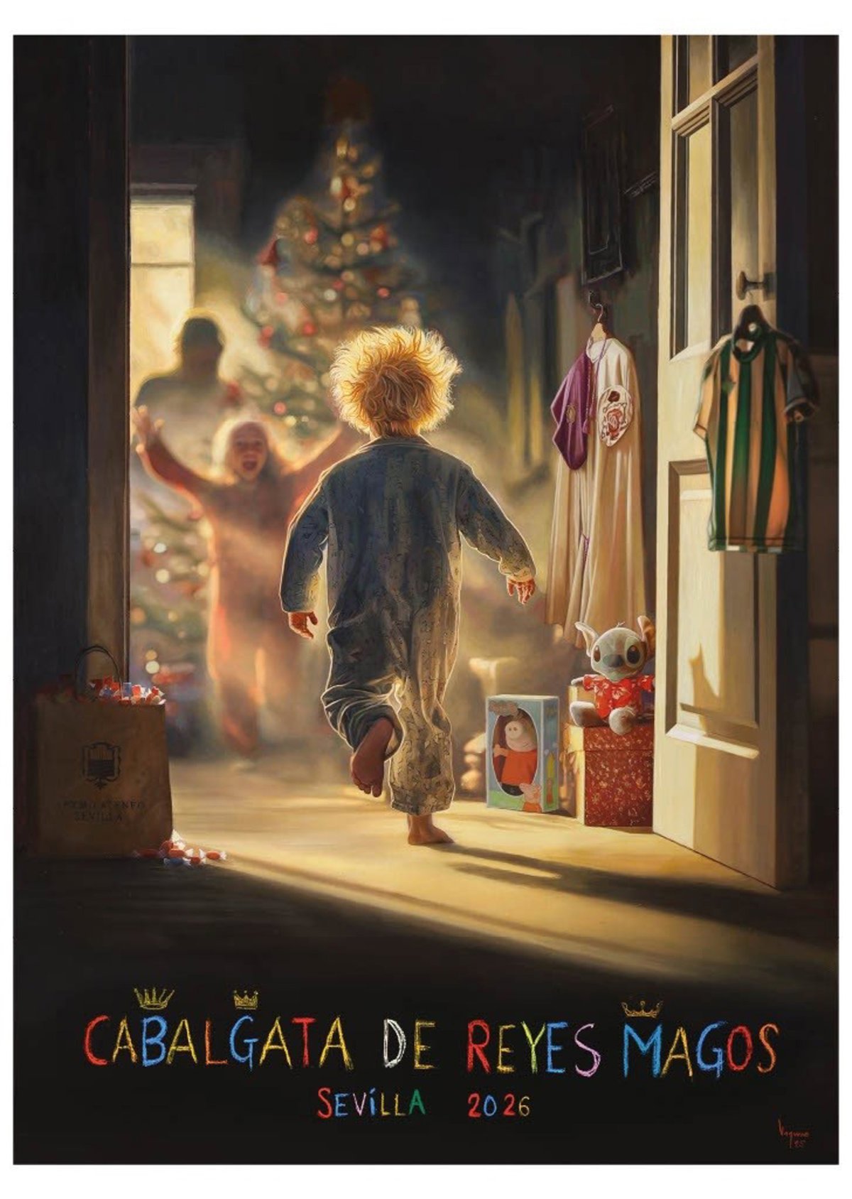 Vaquero ha enmarcado que el cartel, realizado en óleo sobre lienzo, narra una escena íntima inspirada en la mañana del 6 de enero. La imagen muestra una bolsa de papel con el escudo del Ateneo junto a la puerta, simbolizando "la magia que está a punto de renacer", y una estancia iluminada por el amanecer en la que un niño -pintado de espaldas para que "cada uno pueda verse reflejado"- contempla sus regalos. Entre los elementos, el artista incluye detalles personales como el rostro de su hija Julia en una de las figuras infantiles.