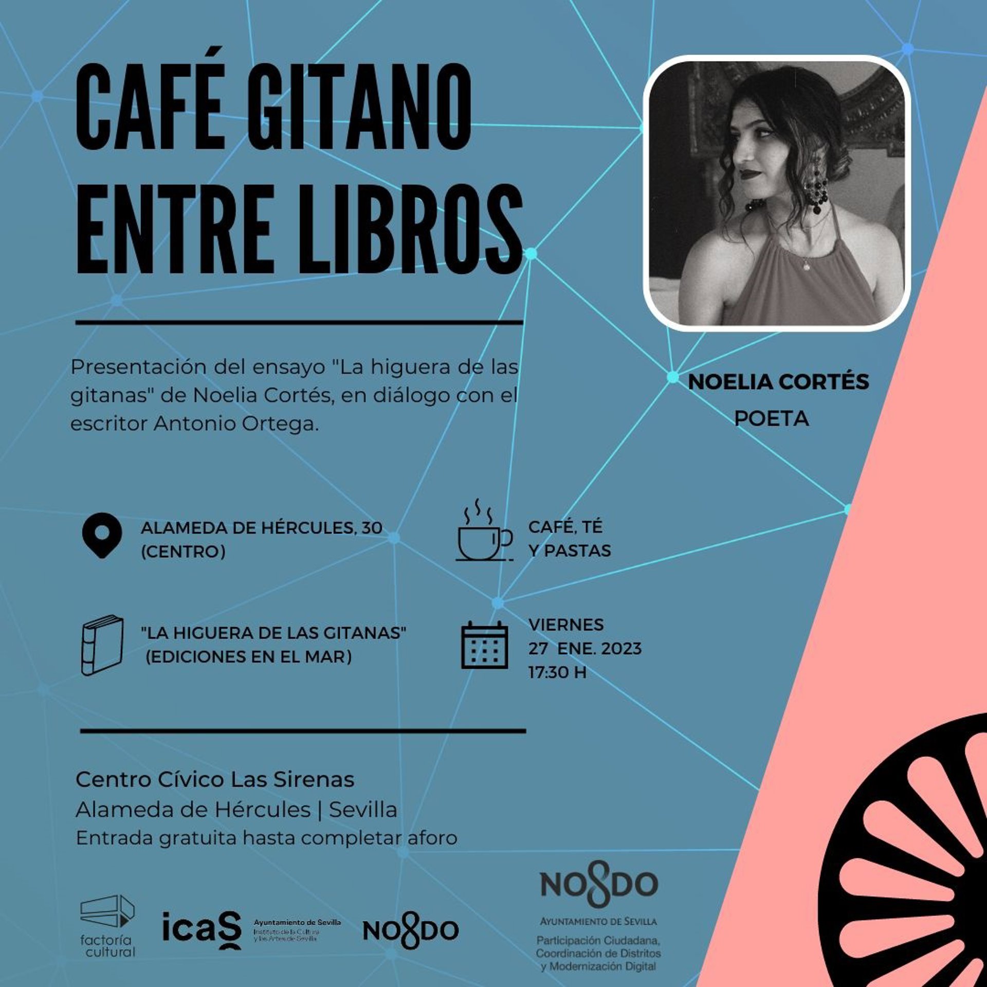 El viernes 27 a las 17,30 horas regresa el ciclo 'Café Gitano entre Libros', organizado el Instituto de la Cultura y las Artes de Sevilla (ICAS), con la autora almeriense Noelia Cortés presentando en el centro cívico Las Sirenas su obra La higuera de las gitanas, en conversación con el escritor y periodista sevillano Antonio Ortega.