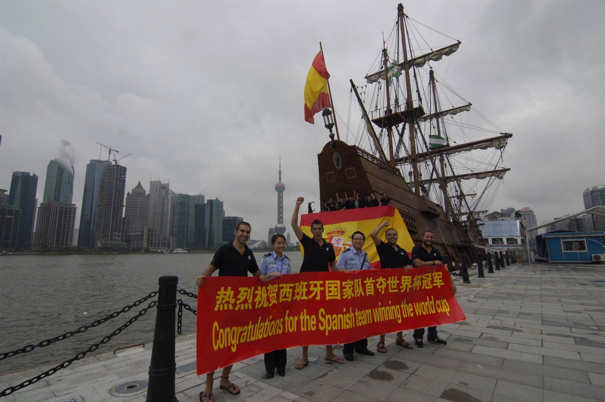 La histórica victoria de la selección de España de fútbol en el Mundial de Sudáfrica también ha sido festejada en Extremo Oriente, concretamente, en la ciudad china de Shanghai, donde la tripulación del 'Galeón Andalucía', que forma parte de la representación andaluza en la Exposición Universal Shanghai 2010, también se ha unido a la celebración del triunfo deportivo de 'La Roja'.