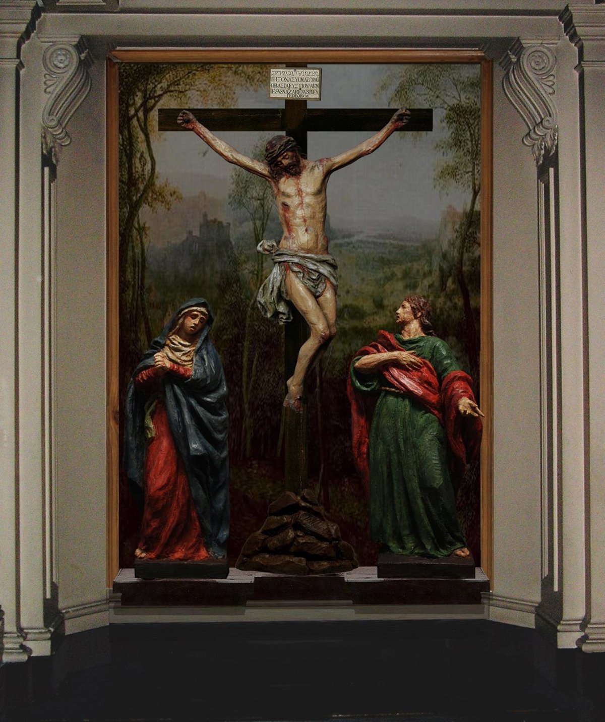 La Virgen y San Juan se dispondrán, como es clásico, de pie, a ambos lados de la cruz. Todo ha sido realizado según la tradición de la escuela sevillana, talladas las figuras íntegramente en madera de cedro y policromadas al óleo; y cuyas figuras miden 1,60 m de altura.