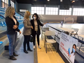 Acompañada de las delegadas de Servicios Sociales, Virginia Gil, y de Deportes, Rocío Bastida, la primera edil ha realizado el recorrido por las instalaciones y ha visto cómo está totalmente señalizado con la cartelería correspondiente señalizando los distintos espacios, que los asientos están señalizados para que los ciudadanos que vayan a vacunarse tengan un lugar seguro y cómodo dónde permanecer sentados a la espera de su turno y a continuación, en otra ala del pabellón, asientos reservados para los minutos de espera tras la vacuna.