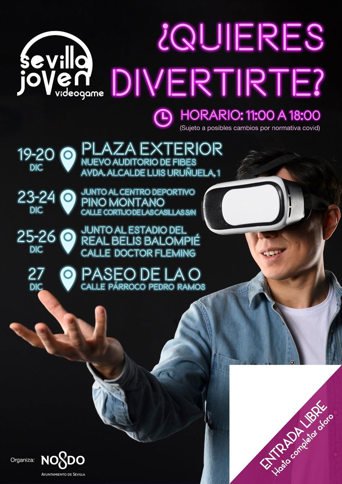 El Ayuntamiento de Sevilla, a través de la Delegación de Juventud, pone en marcha una iniciativa para fomentar el uso responsable de los videojuegos y, al mismo tiempo, ofrecer una alternativa de ocio a la juventud sevillana. Se trata del evento Videogame Sevilla Joven, que arranca el próximo 19 de diciembre y se desarrollará durante las Navidades, coincidiendo con las vacaciones escolares, en diversos puntos de la ciudad y con todas las medidas de seguridad sanitarias necesarias de prevención frente al Covid-19.