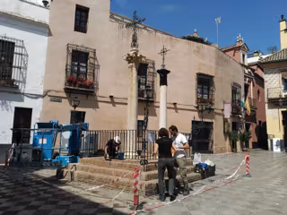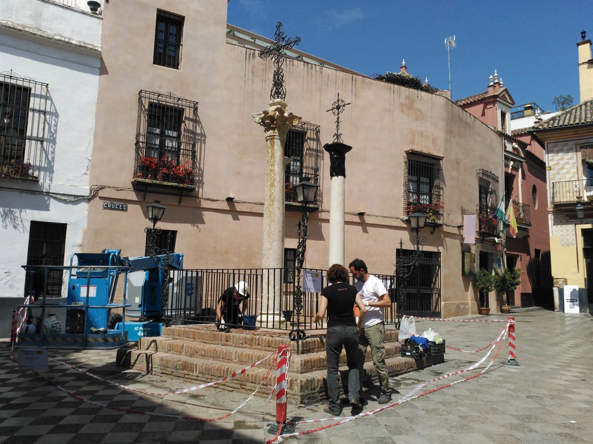 En este marco, Muñoz ha visitado este martes la intervención que se lleva a cabo en la plaza de las Tres Cruces de Santa Cruz, con una inversión de 6.000 euros para recuperar sus tres columnas de época romana del Hospital de los Venerables y el hierro forjado de los años 60.