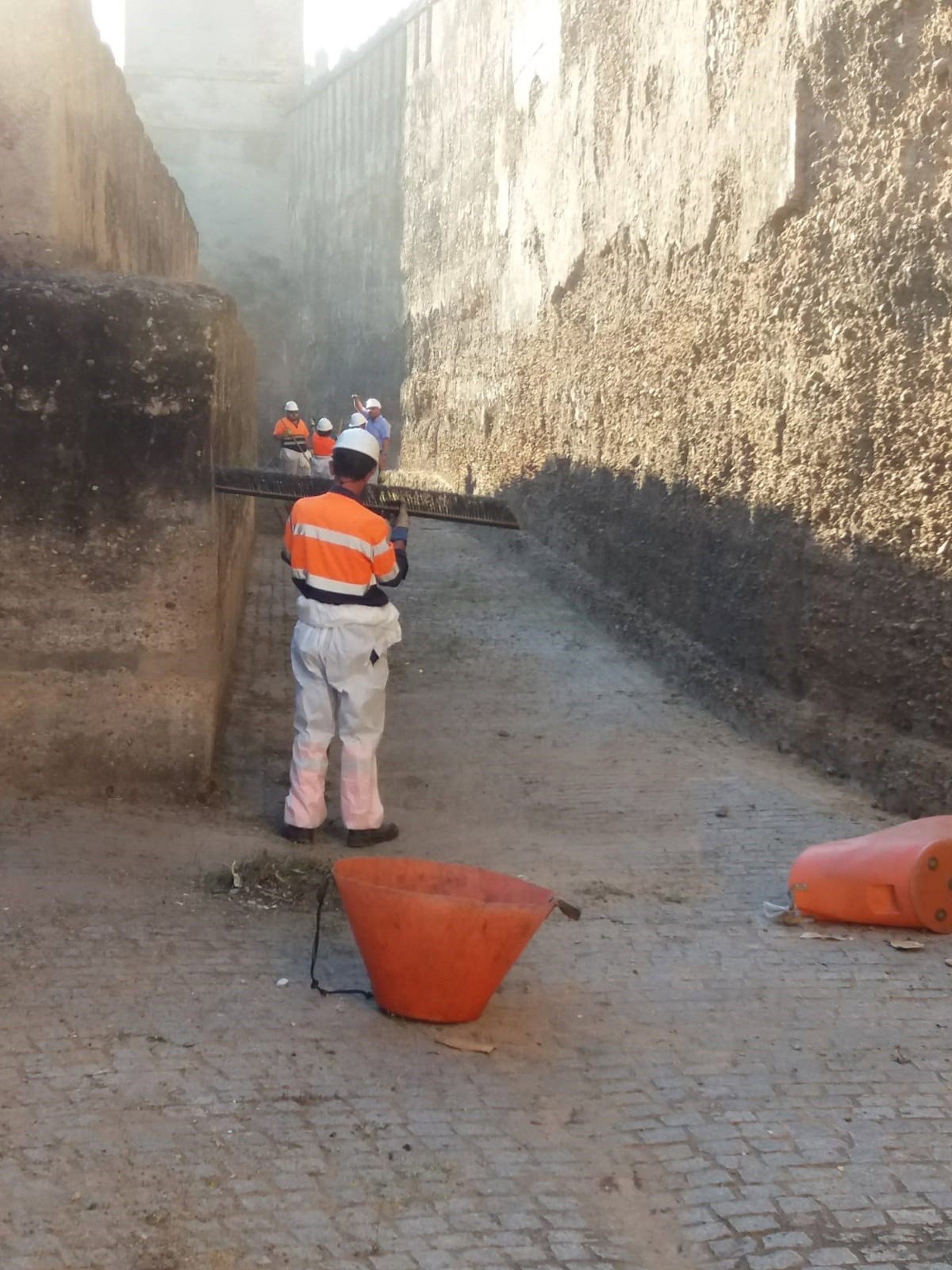 Para ello, el dispositivo que ha llevado a cabo estas labores de limpieza ha estado formado por seis operarios, dos camiones brigada, una desbrozadora y una sopladora, todo ello bajo la supervisión de un capataz, acometiendo tareas como la aplicación de varios tratamientos, destacando el desbroce de hierbas y la retirada y barrido de residuos acumulados en el adarve.