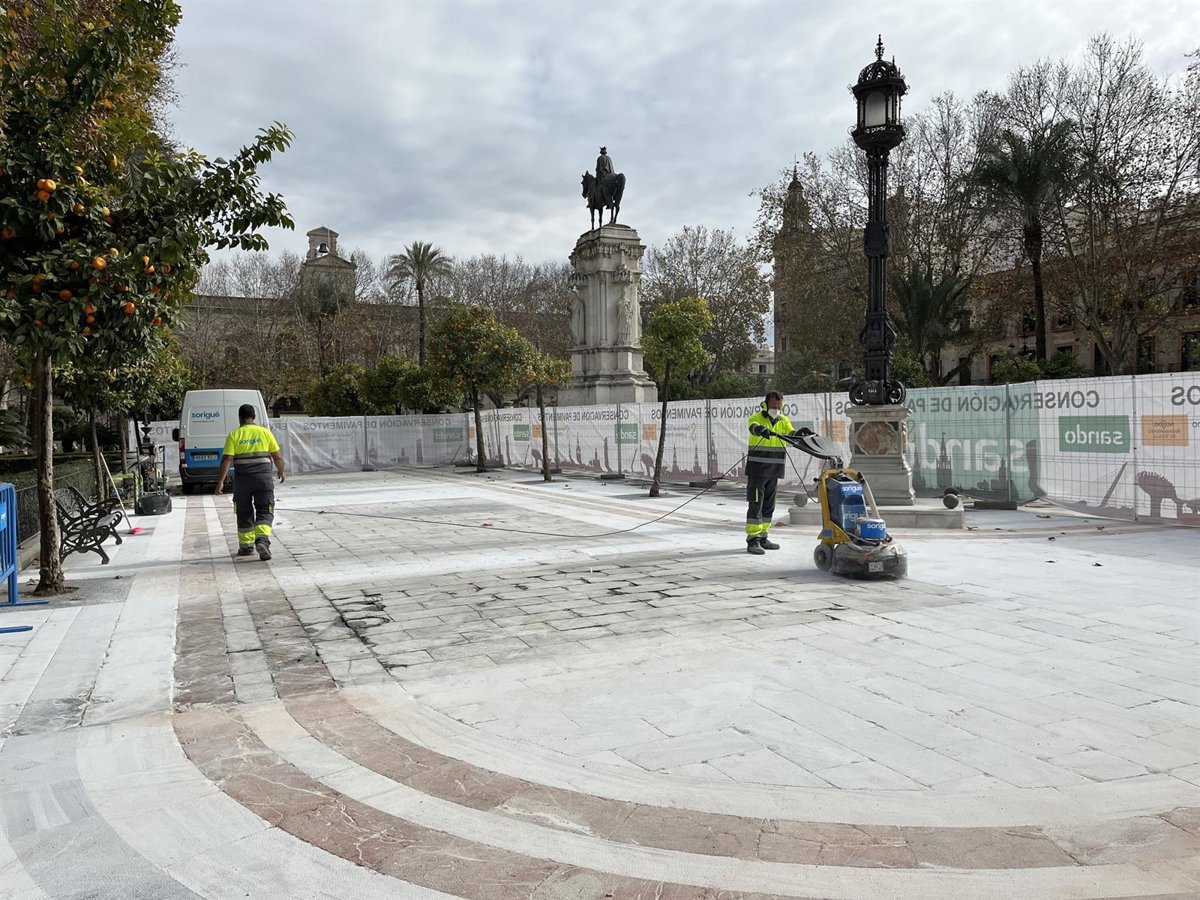 El Ayuntamiento de Sevilla, a través de la Gerencia de Urbanismo y Medio Ambiente y en coordinación con el Distrito Casco Antiguo, está aplicando estos días al pavimento de mármol de la Plaza Nueva un tratamiento especial superficial (microabujardado) para evitar resbalones cuando llueve.