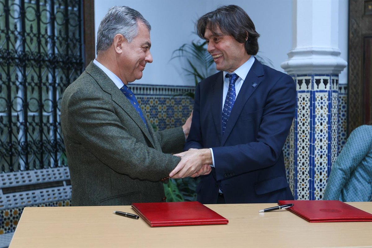 El alcalde de Sevilla, José Luis Sanz, y el rector de la Universidad Pablo de Olavide, Francisco Oliva, han formalizado este lunes el convenio de cesión del Pabellón de Marruecos de la Exposición Iberoamericana de 1929 como nueva sede de la institución académica en la ciudad.