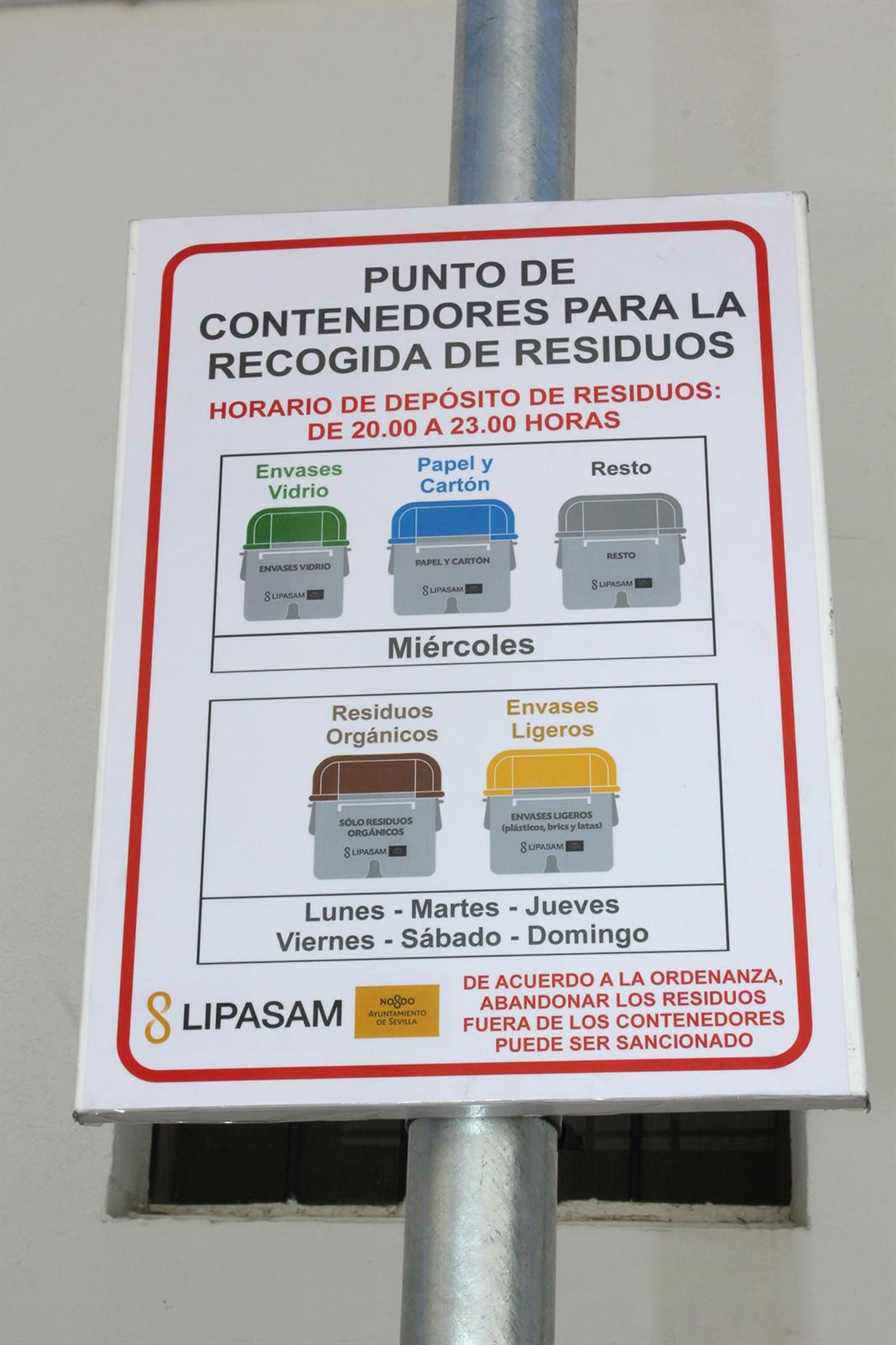 Los lunes, martes, jueves, viernes, sábados y domingos, será el turno de los contenedores para envases (tapa amarilla) y orgánica (tapa marrón), y los miércoles para los de papel y cartón (tapa azul), vidrio (tapa verde) y resto (tapa gris). En la ubicación se colocará una señal informando de los horarios y de los tipos de residuos que se recogerán cada día.