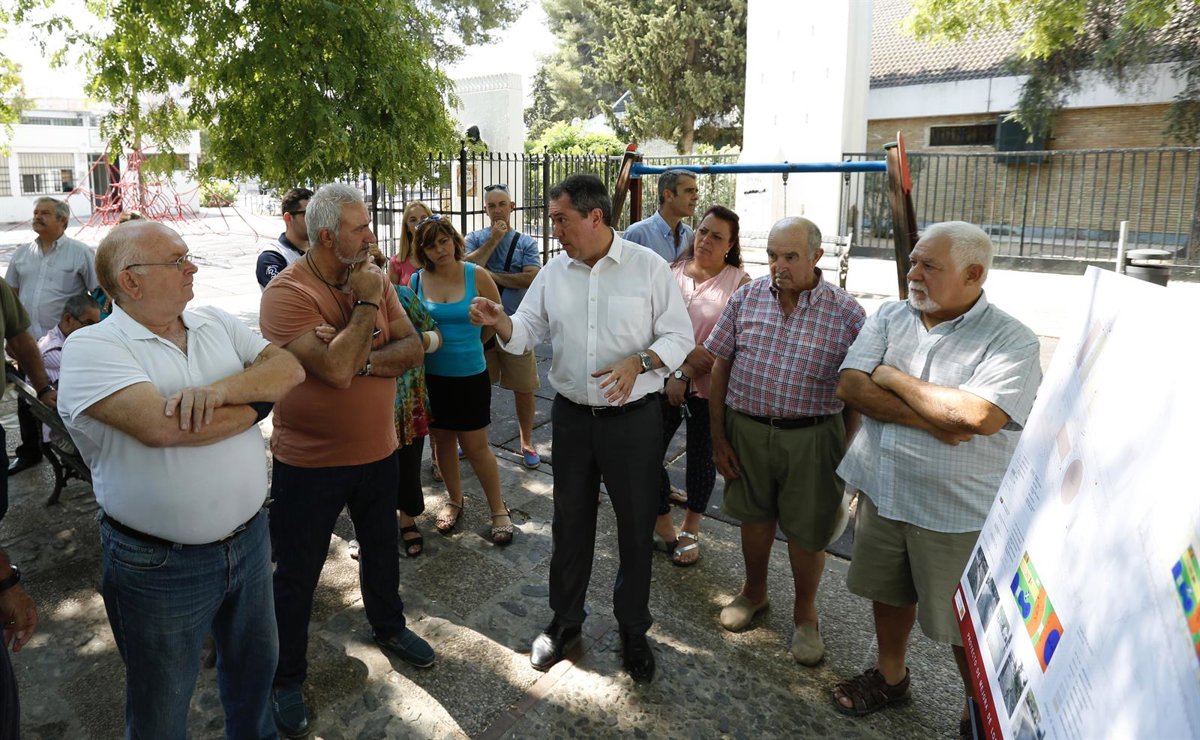 El alcalde de Sevilla, Juan Espadas (PSOE), junto al delegado del distrito Cerro Amate, Juan Manuel Flores, y representantes técnicos de la Gerencia de Urbanismo han mantenido un encuentro con los vecinos, así como con las entidades, para informarles del diseño definitivo de las obras y de su inicio inminente.