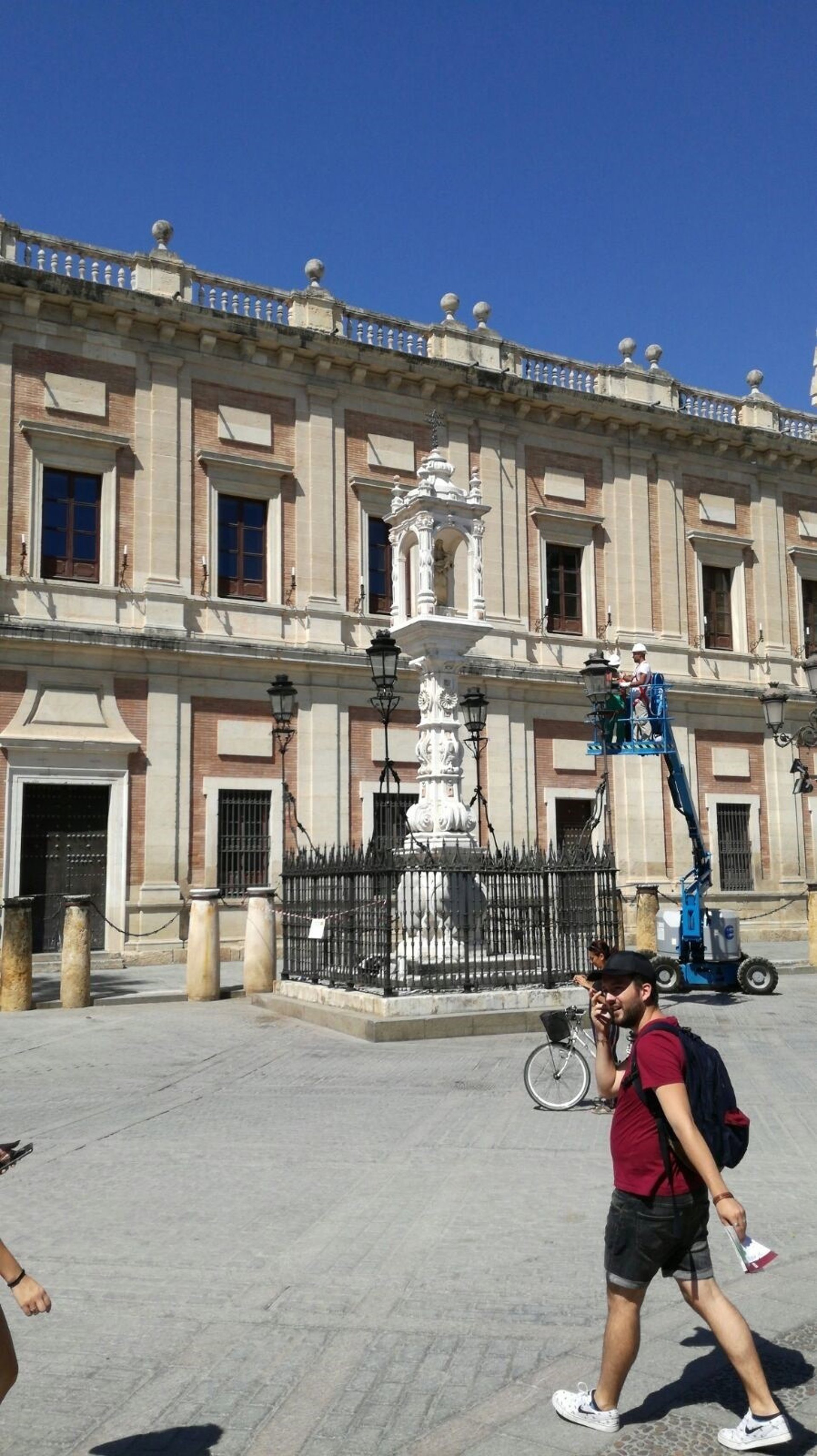 El Ayuntamiento de Sevilla, a través de la Gerencia de Urbanismo, está llevando a cabo una intervención con carácter de mantenimiento en el monumento del Triunfo de Nuestra Señora del Patrocinio, ubicado a la espalda del Archivo de Indias, en la Plaza del Triunfo.