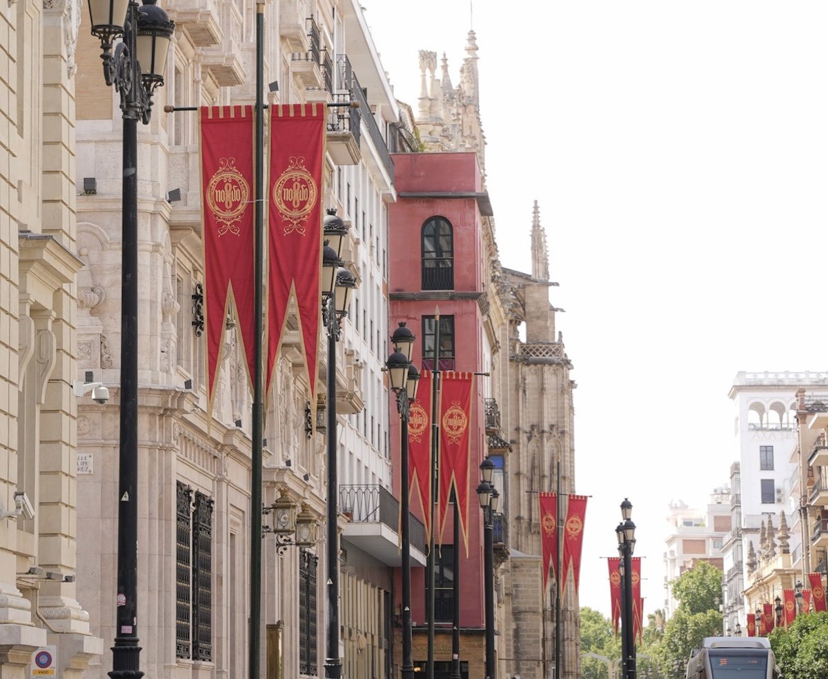El Ayuntamiento de Sevilla ha instalado este sábado las banderolas que adornarán el paso de la procesión del Corpus Christi el próximo 19 de junio, unos elementos que este año estrenarán banderolas. Por ello, el Consistorio a través de la delegación de Fiestas Mayores, ha realizado 46 nuevas banderolas para los 23 gallardetes que exornan el recorrido.