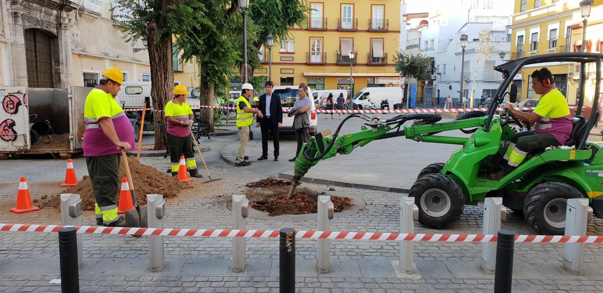 El Ayuntamiento de Sevilla, a través de la delegación de Parques y Jardines, ha comenzado los trabajos previos para la plantación de nuevos árboles en la Plaza del Pumarejo que se encuadran dentro de la programación de 5.000 nuevos ejemplares que se cultivarán en toda la ciudad.