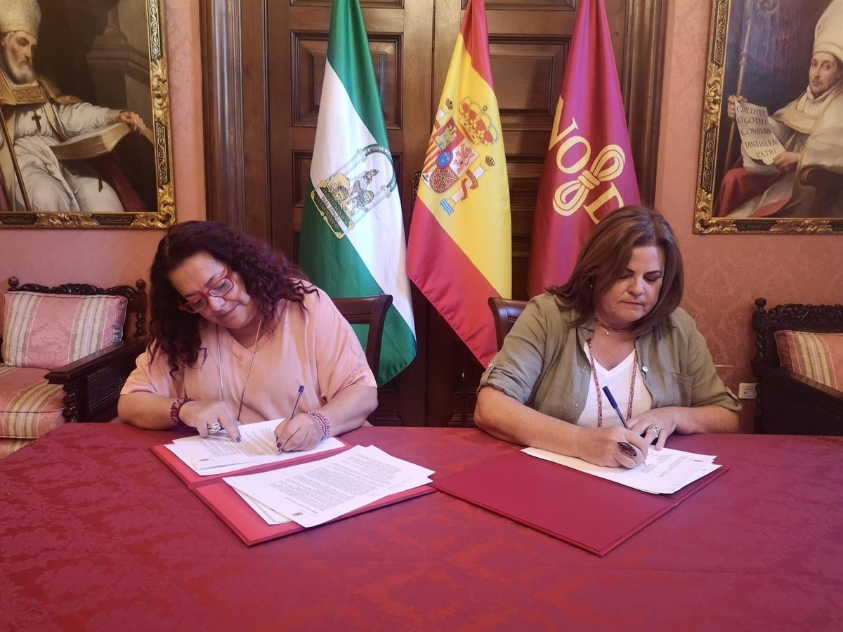De izquierda a derecha, la delegada Encarnación Aguilar y María de los Ángeles Fernández en representación de la Fundación Centro Español de Solidaridad de Sevilla Proyecto Hombre. - AYUNTAMIENTO DE SEVILLA